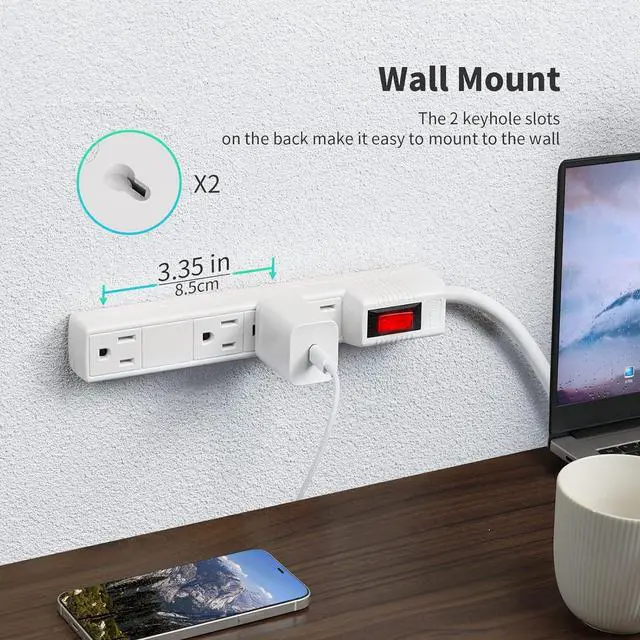 Wall Mountable: This wall-mounted power strip can be firmly installed on the wall, under the workbench through the 2 slots on the back, rationally optimizing the desktop space. (with 2 screws)