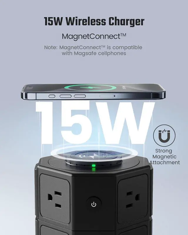 Magnet Connecting Wireless ChargerThanks to the 15W Magnet Connecting wireless charger on top, you can simply place your cellphone on the charger and it will be automatically aligned by magnet and stay firmly on the charger to be charged (compatibility with magnet alignment feature is required for the cellphone. )