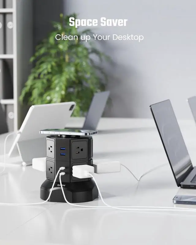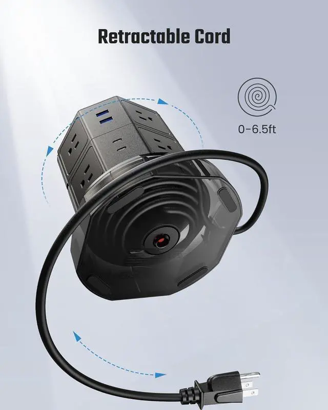 Space Saving and RetractableThe small footprint power tower manages its 6.5 ft power cord by rolling the main body, combined with vertical tower design with a small footprint base to offer you a self-adjusting reach to the wall outlet but covers zero extra space, keeping your desk clean and tidy.