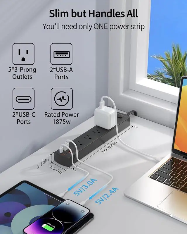 Maximize Your Space - Ultra thin flat plug with a slim 0.33 -inch profile and 45° right-angle design, thinner than an Apple phone. Our power strip fits easily behind furniture and won' t block other outlets. Good for dorm rooms, home offices etc.