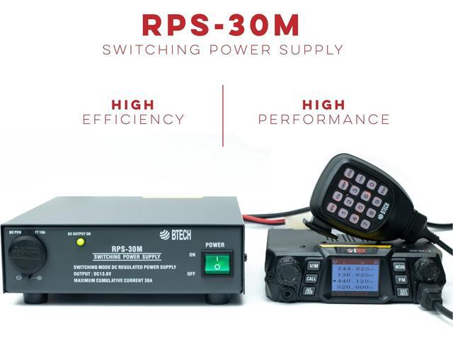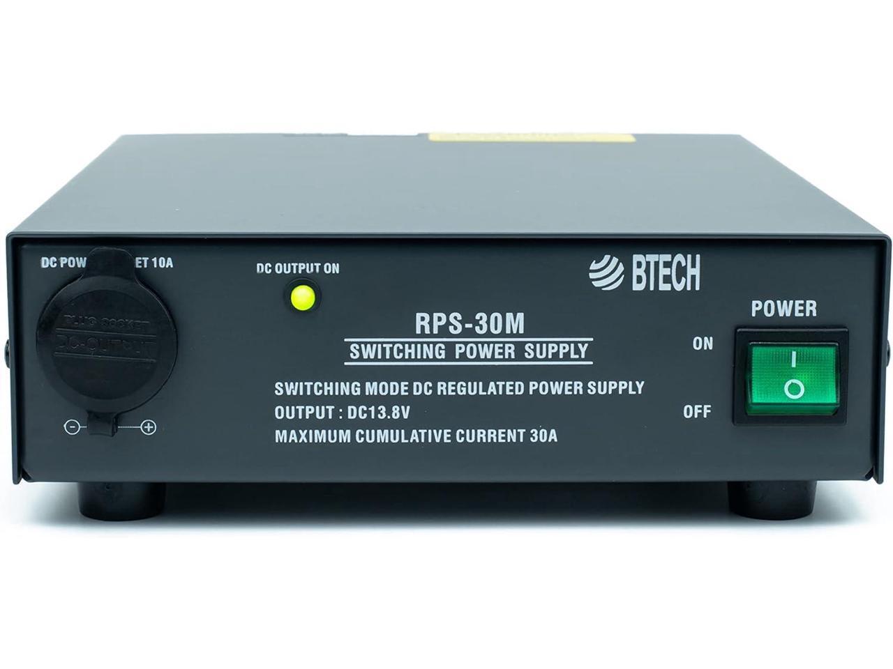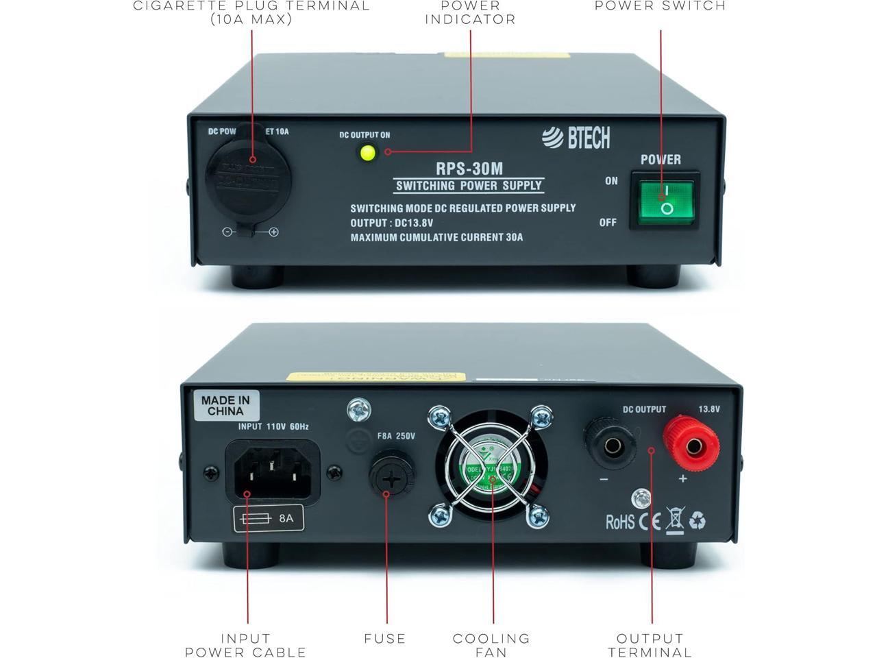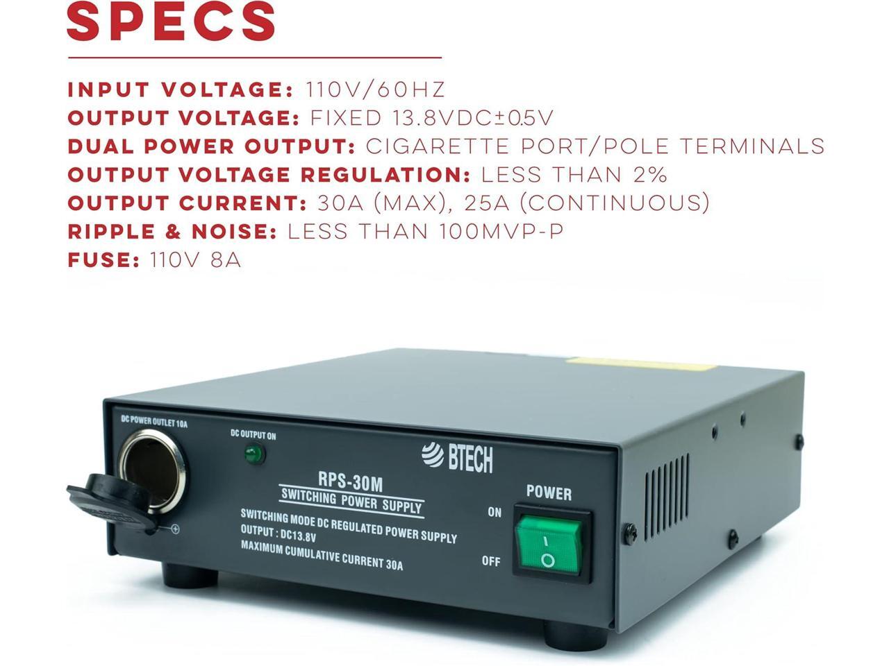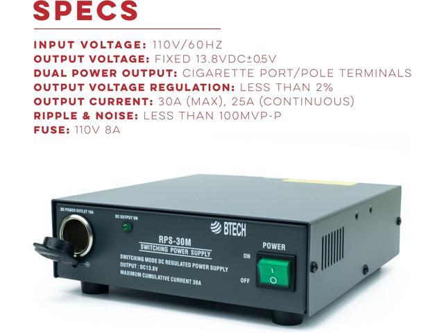 BTECH RPS-30M 30 Amp Compact Regulated Bench Power Supply - 13.8V AC-to-DC Converter with Screw Terminals & Cigarette Plug Output