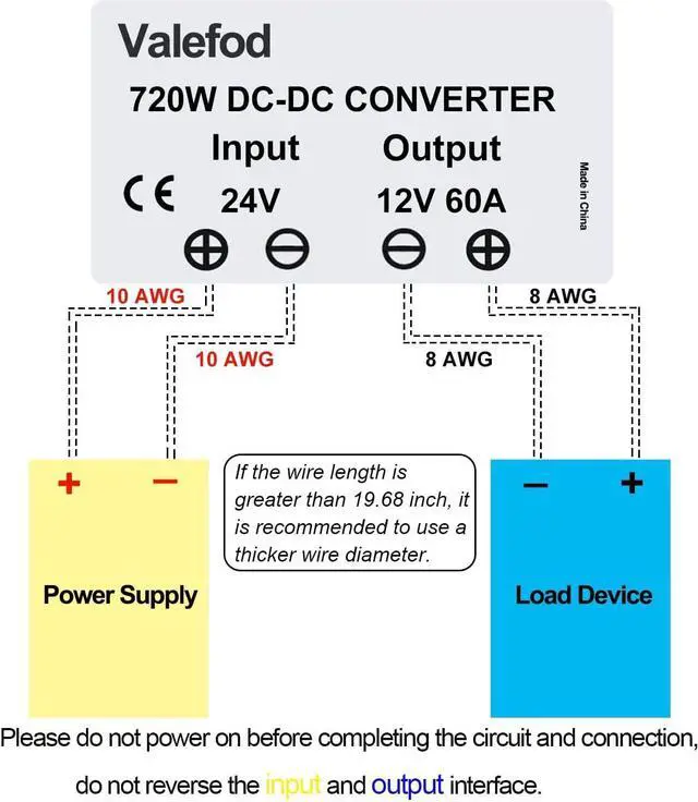 Easy to DIYConnect INPUT terminals to power source, OUTPUT terminals to your load device. The wiring diagram is printed on the back of buck converter. Please don' t power on before completing the circuit and connection, do not reverse the input and output interface.