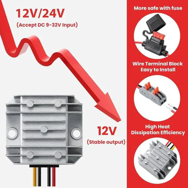Wide application9-32V to 12V Voltage Power Converter use to Large trucks, Golf cart, Club car, taxi radio, emu, car audio, LCD TV, advertising screen, LED strip lights, monitoring system, electronic systems and DIY etc.