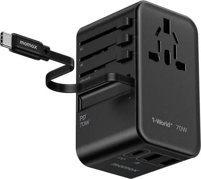 PD 70W Fast Charging: This international adapter is equipped with 1 USB-C Built-in Cable, 1 USB-C ports, 2 USB-A ports and 1 AC outlet (1250W Max in US) and supports PD 3.0 & QC 3.0 fast charging. The USB-C PD ports can even reach an incredible high speed of 70W. It is ideal for your USB devices, especially laptop, smartphone, tablet, power bank, camera, Vision pro, etc.