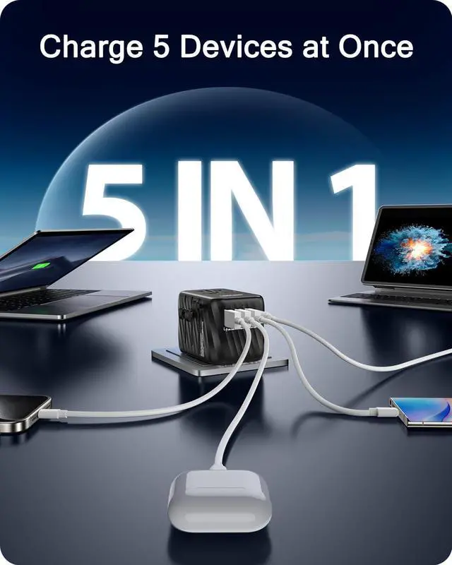• 5-IN-1 International Wall Charger: Features a universal AC outlet (250V/10A, 2500W Max) and multiple USB ports; Charge 5 devices simultaneously, eliminating the need for extra adapters or chargers on international trips
