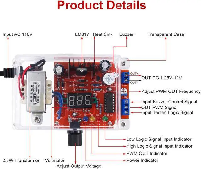 Logic Signal Test Circuit: The adjustable regulated voltage power supply electronics kit has a logic pen function, which is convenient for testing the logic level of the circuit. With 1 channel buzzer. Can test the continuity of the wire, and can also test low-frequency signals
