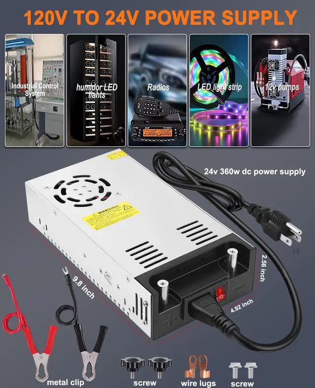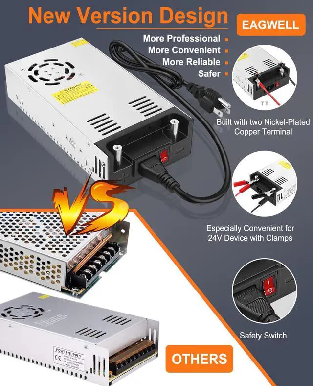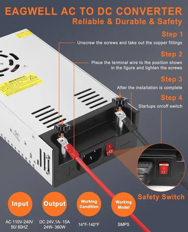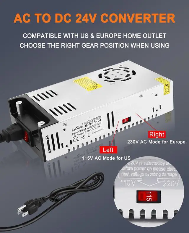 Eagwell Power Supply is an AC to DC 24V converter that supports input voltage from AC 110V-120V / 220V-240V. The output range is from 24V 1A-5A, 24W-120W or 24V 10A-15A, 240W-360W. The voltage input automatically adjusts to the SMPS model, and the output current depends on your device. For example, it can handle devices with 5A 120W, 10A 240W, 15A 360W, and a maximum current of up to 15A, providing a power output of 360W