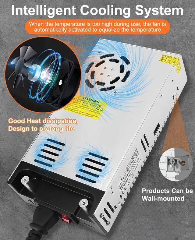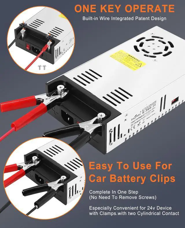 Eagwell AC to DC converter! It features an imported aluminum alloy shell and a built-in wire integrated design. With dual power connection options, it's incredibly convenient for 24V devices with clamps. Our power supply comes with a UL-certified power cord, wire lugs, metal clip, and screw, making it super convenient for devices with clamps. Simply clamp them onto the two cylindrical contacts. This 24V DC power converter is a patented design