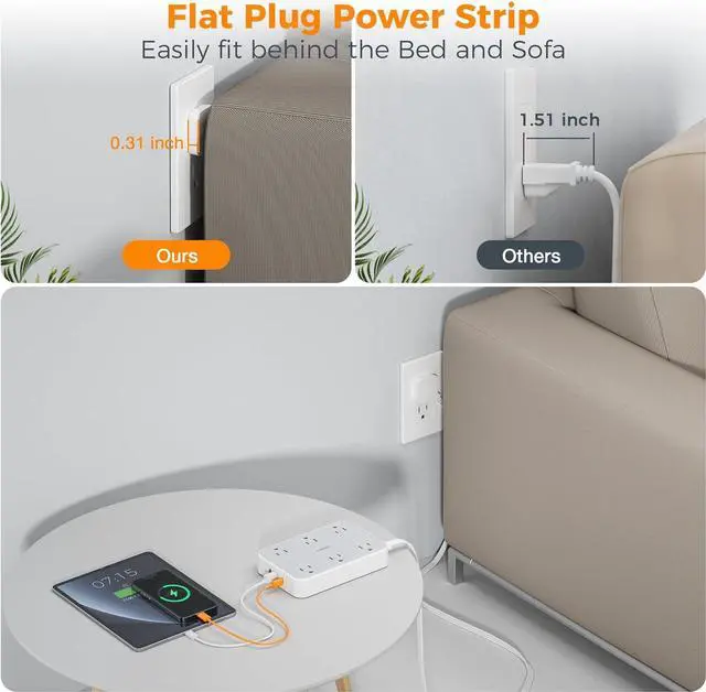Ultra Thin Flat Wall Plug: Featuring an ultra thin 0.3 in flat head design, this flat plug extension cord can easily fit into tight spaces and hide discreetly behind sofa, bed, nightstand, or other furniture; The 45 degree right angle design creates additional space for other plugs below without blocking