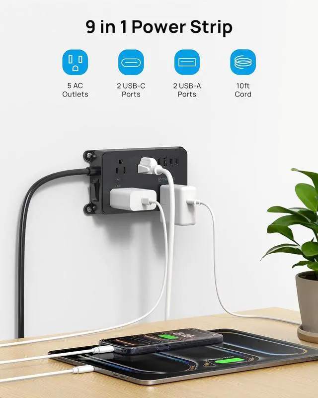 Power Strip: This surge protector turns a regular wall outlet into 5 grounded AC outlets plus 4 USB charging ports (2 USB C), which provides power and charging for up to 9 devices.