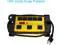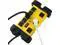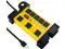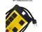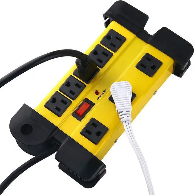 Metal industrial power strip with yellow aluminum housing and black outlets, wall mountable design, perfect for hooking up all the gadgets at work.