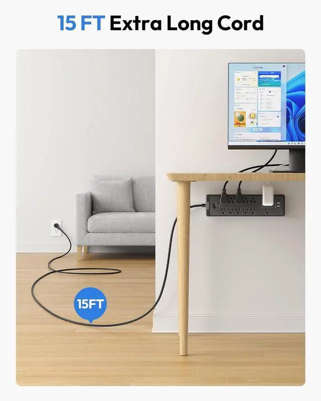 Surge Protector Flat Plug Outlet with Long Cord - The Extra long 15ft heavy duty surge protector extension cord gives you the flexibility to reach distant outlets and hard-to-reach places. A perfect solution for when power outlets are not conveniently located nearby. The low-profile 45° design allows the flat plug extension cord to easily fit in tight spaces like behind furniture, bookshelves, desks, and more. Save a lot of space, and move furniture closer to the wall without bending the cord.