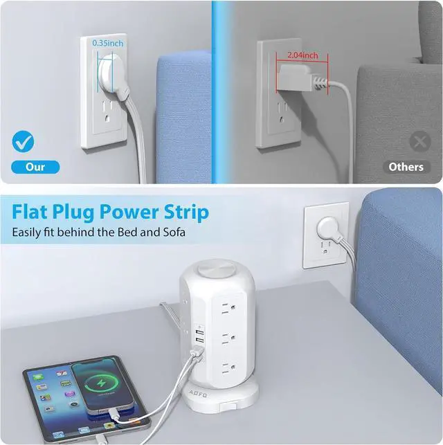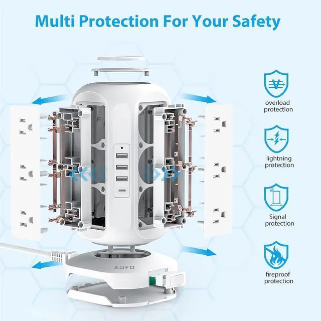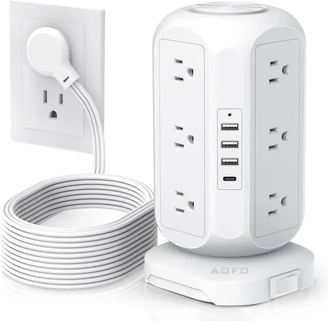 Space-saving unique tower design: AOFO charging station adopts a unique vertical design, and the top adopts a delicate CD pattern design, so that your power strip are not monotonous, and you do not need to worry about the large plugs blocking each other, which helps you save space and is beautiful. Choose this office supply to keep your desktop clean and beautiful.