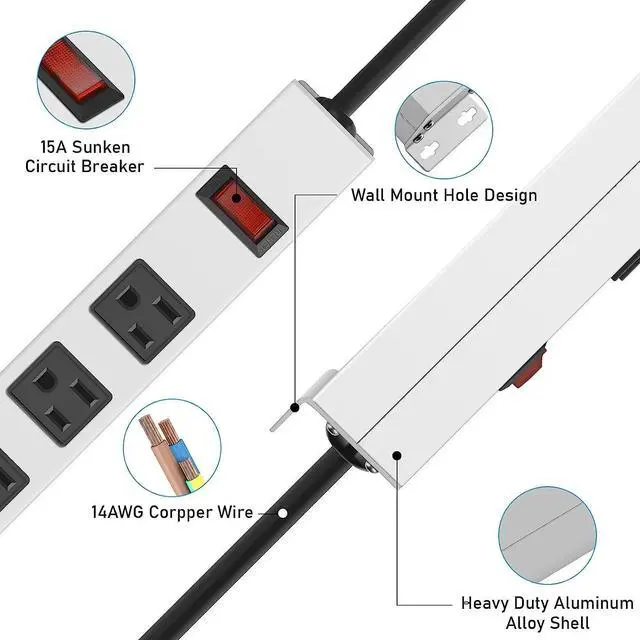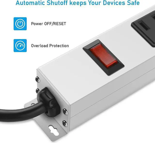 Metal Power Strip Surge Protector: With overload protection, the reliable overload switch will trip off automatically to protect your devices when over-voltage, over-current, overload, high-temperature, short-circuiting.