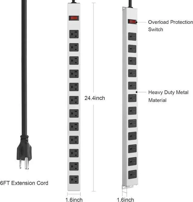 Long Power Strip 12 Outlet: Providing enough space between the sockets to accommodate big plugs. heavy duty surge protector was connected with 6ft 14AWG/3C power cord, Equipped with 15A high current, Max: 60Hz/125V/15Amp/1875W.
