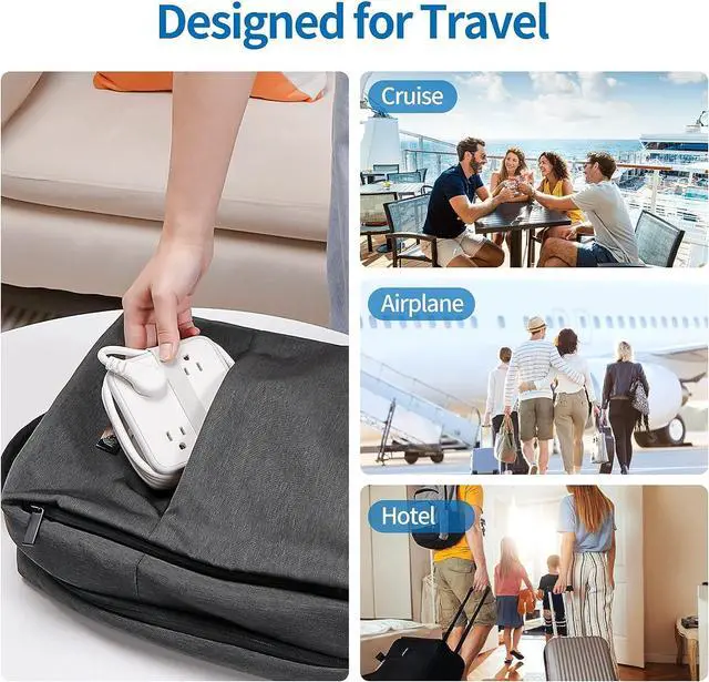 Compact Power Strip for Travel The NTONPOWER compact power strip size is ( 4.13 * 4.13 * 1.57 inch). This portable travel power strip can fit comfortably in your suitcase or backpack. There is no surge protector in this travel power strip with usb ports, which is allowed to bring on cruise ship and airplanes. Ideal to bring during business trips and vacations to keep all your essential devices charged.