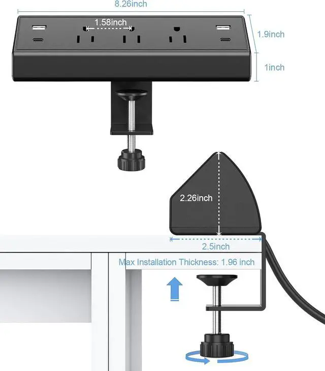 This desk clamp power strip doesn' t require screws and doesn' t require holes in the table, which helps organize the power cord, doesn' t require much space, and doesn' t worry about safety.