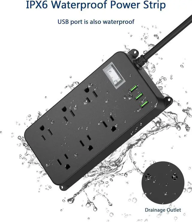 Water-Resistant & Splash-Proof: Rated IPX6, this electric shock-proof multi-outlet power strip works well in both humid and rainy conditions. Use it safely in a bathroom, near a pool or outdoor shower, on your deck or patio, while camping, or to power your Christmas lights.