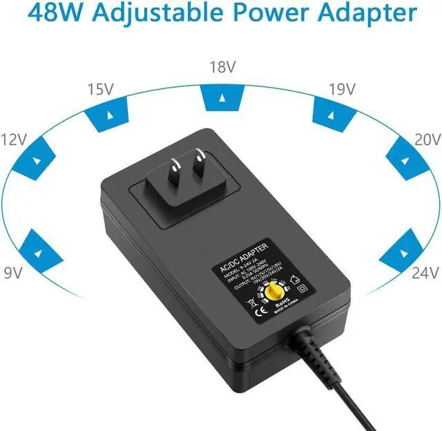Input: AC 100~240V, 50/60Hz; Output. DC 9V 12V 15V 17V 19V 20V 24V adjustable, max 2A 48W. Can provide any current less than 2A, such as 500mA 800mA 1A 1.2A 1.5A 1.8A 2A. with 5.5 mm x 2.5 mm DC plug. Adjustable voltage can better match device parameters and supply more accurate and flexible changes.