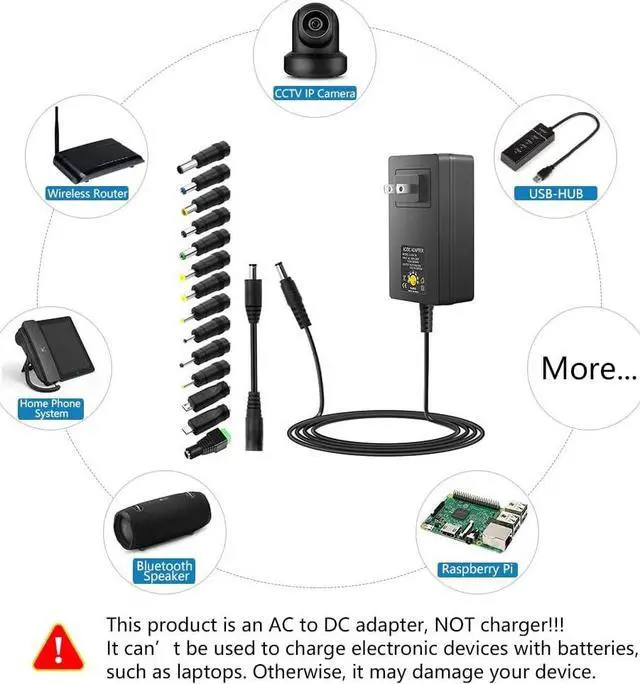 The 48W all-in-one multipurpose AC/DC adapter fit for many 9~24V under 48W small electronics such as Wireless router, LED light strips, TV boxes, Photo frames, Bluetooth players, Wireless headphones, Speakers, USB hubs, Wifi camera, Bluetooth charging boxes, Printers, Security Monitoring System, 9~24V small home electronics, etc. This product is an AC to DC adapter, NOT charger!!! It cant be used to charge electronic devices with batteries, such as laptops. Otherwise, it may damage your device.