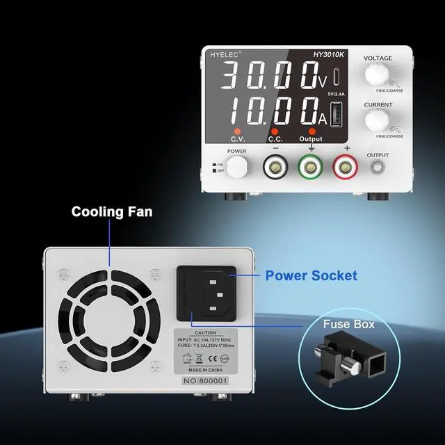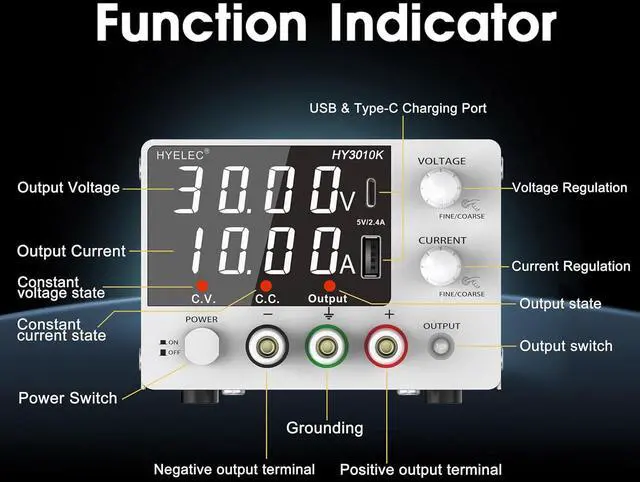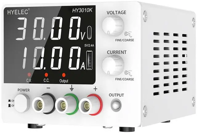 High PrecisionHYELEC adjustable dc bench power supply with precise encoder knob, using coded potentiometer, Coarse and fine adjustments can be switched with one click as needed, which allowing for precise adjustment of voltage and current respectively, display precision 0.01V and 0.01A, high precision LED display, stable value does not jump word.