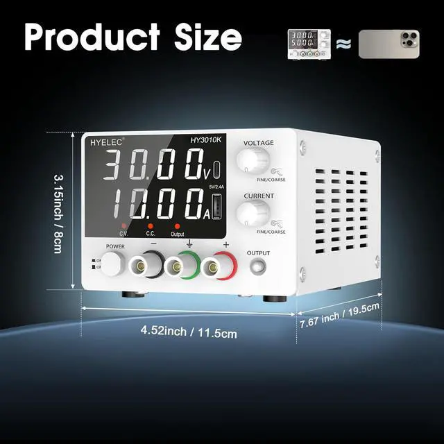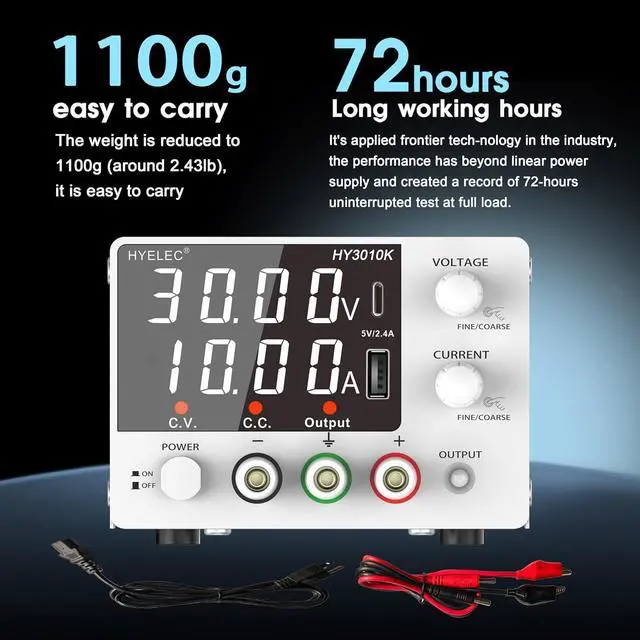 Small size, USB and Type-C interfaces This compact DC power supply weighs only around 2.43 pounds, making it easier to carry and saving more space for your workbench. The desktop power supply features 5V 2.4A USB and Type-C charging ports, which can charge small smart devices simultaneously.