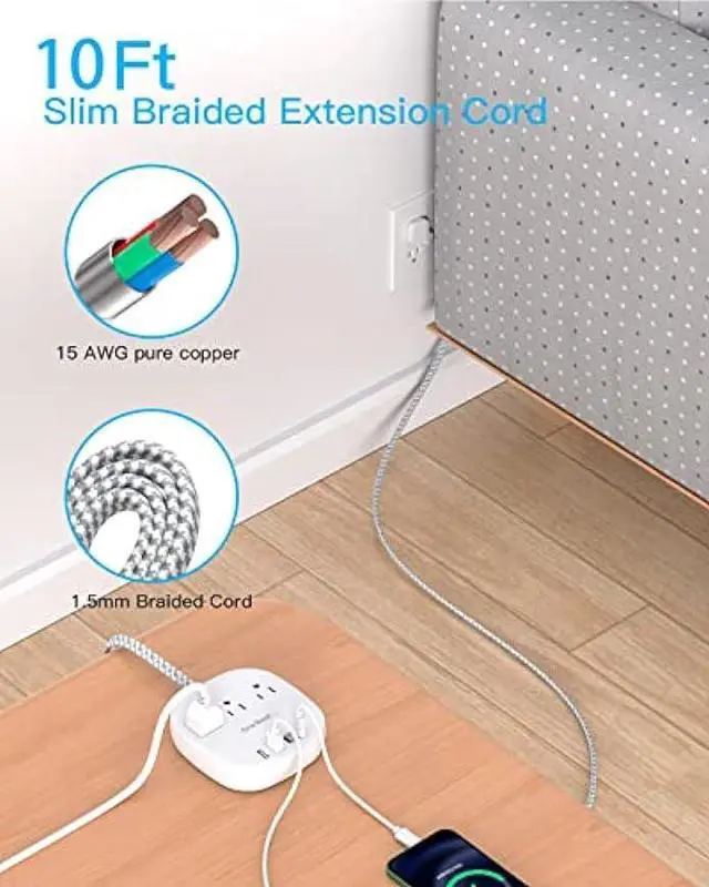 Right Angle Ultra Flat Plug & 10 Ft Braided Extension Cord - With only 0.35 inch ultra thin plug and 45 degree right angle design, which is mush slimmer than traditional plugs, can close to the wall easily and hide in the back of furniture, no waste for outlet and space. 3mm thicker extension cord is made of pure copper, which has better current carrying capacity (15A). The braided power cord is not easy to deform, durable and more safety.