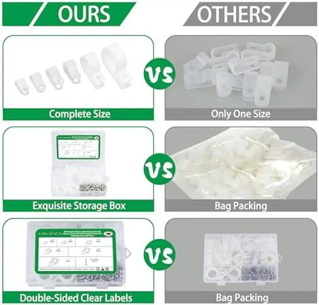 Provide Excellent Storage Box We want our customers to be simple and clear every time they use a white R-type cable clamp, so we put 6 sizes of R-type cable clamp in 6 grids and each grid is marked with a size label. We also 1: 1 configured the appropriate M4 nickel-plated hardened screws for your R-type clamp.