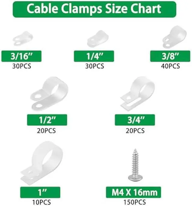 Popular Sizes & Wide Application There are a total of 150 pieces of nylon R-type cable clamp in 6 sizes: 3/16 1/4 3/8 1/2 3/4 1. These sizes contain almost the 6 most commonly used sizes in our life, such as TV cords, routing cables, snowmobile wires, LAN cables, Ethernet cables, computer and electrical power cables, and desk wall cables.