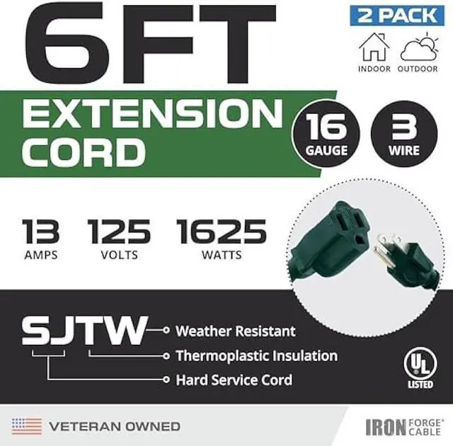 Certified Safe and Powerful UL listed and rated at 13 amps, 125 volts, and 1625 watts, this extension cord heavy duty includes a grounded 3-prong plug and 16/3 gauge wiring, offering safe and efficient power delivery across 6 feet.
