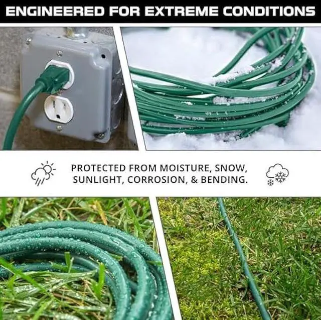 All-Weather Durability Built with a rugged SJTW vinyl jacket, this electric cord is weatherproof and water resistant, shielding it from rain, snow, sun, and corrosion. Flexible in freezing temperatures down to -40°F, it's reliable in any season.