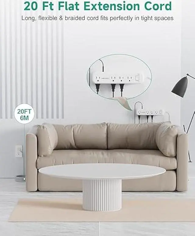20 FT Flat Braided Extension Cord & Ultra Thin Flat PlugThe 20ft extension cord provides the flexibility to access outlets that are far away and difficult to reach. The braided cord is durable and only 0.15 inches thick, making it perfect for use under carpets and through door gaps. The 0.4 inches flat plug allows for easy installation behind sofas, TV cabinets, and other furniture.