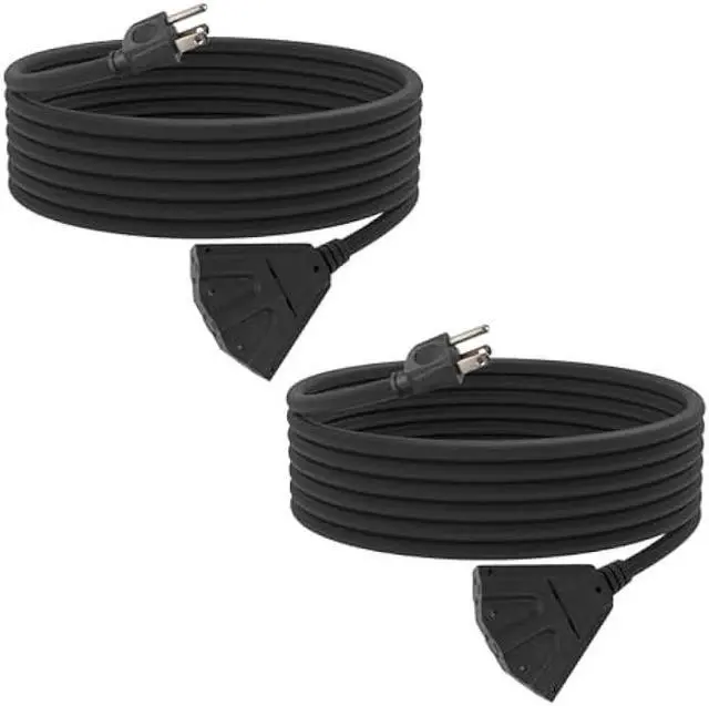 2 Pack 15 Ft Outdoor Extension Cord with 3 Electrical Power Outlets - 16/3 SJTW Black Cable with 3 Prong Grounded Plug
