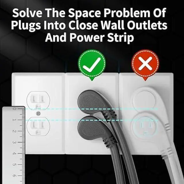 Flat plug & space saving: HUANCHAIN low profile extension cord plug has a 45° angle S-shaped design to fit into a top wall outlet without blocking the bottom outlet; Black Extension cords with flat plugs are designed for tight spaces; bringing furniture such as sofas, TVs, desks, cabinets, and nightstands closer to the wall without damaging the plug; making better use of corner wall outlets