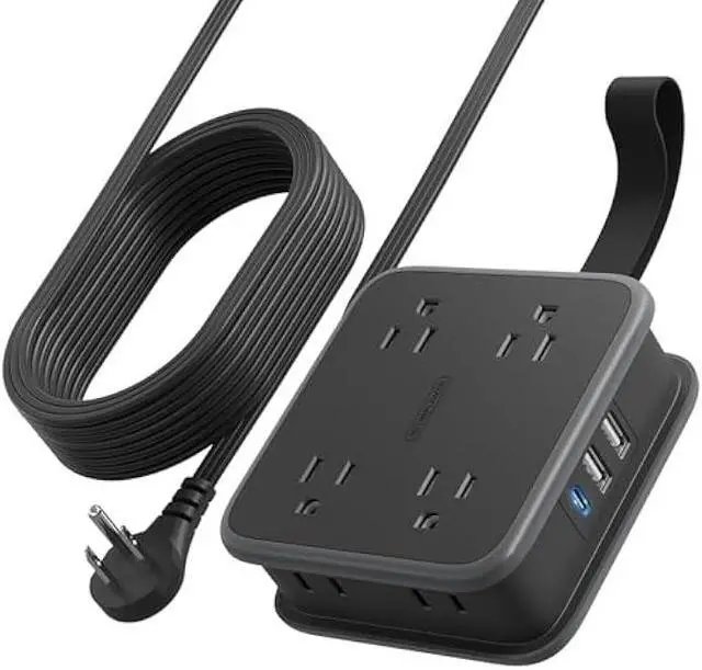 6 Foot Flat Extension CordThe flat extension cord does not occupy desktop space and keeps the desktop tidy. The 6 feet extension cord meets your daily use needs. The power cord can be wrapped cleverly around the side of the black power strip. With the help of straps, the cord will not be a mess