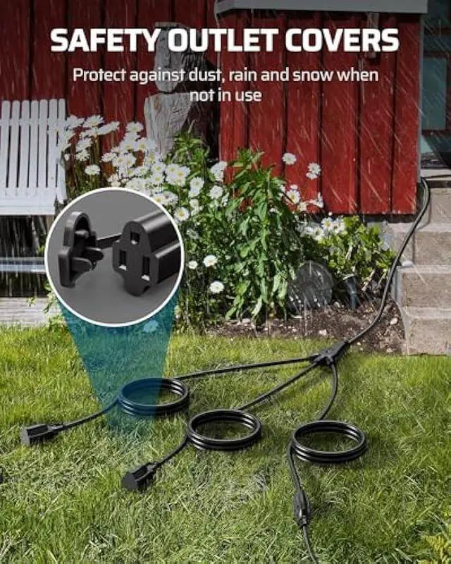 Safety Outlet Covers 3 grounded outlets extension cord is rated for use in wet locations; each outlet plug comes with a safety cover which will protect against rain, snow, and dust