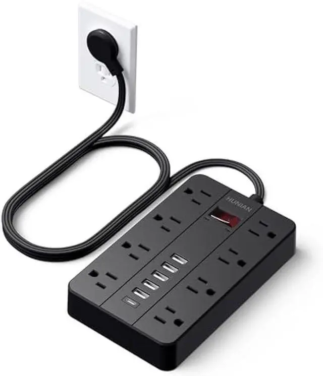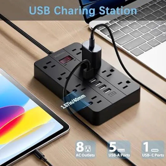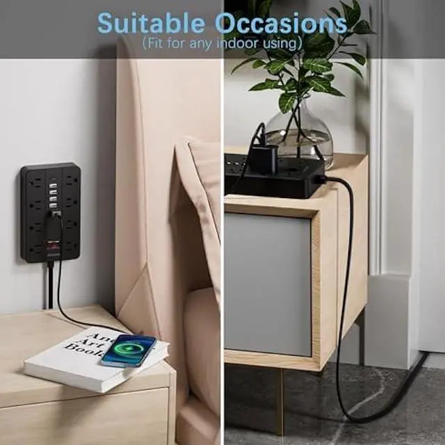 Multi Outlets Widely Spaced Power Strip: power strip surge protector with 8AC widely outlets and 6 USB charging ports, can power up to 14 devices simultaneously; You can use it in any indoor place such as home, office and dorm room