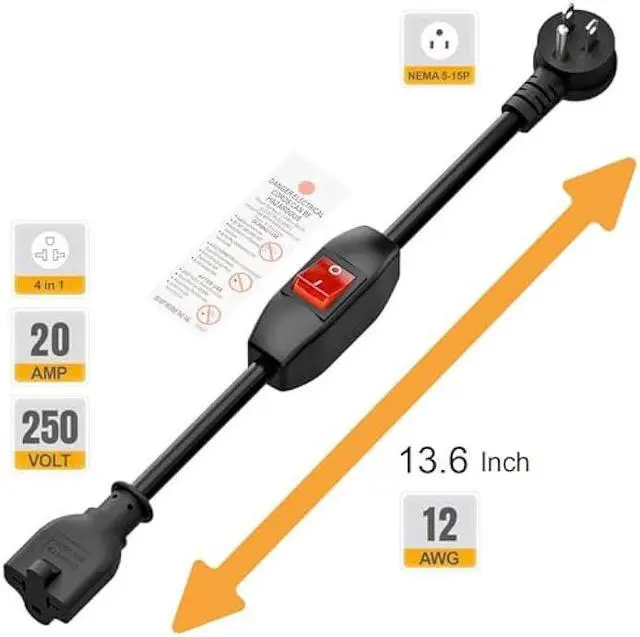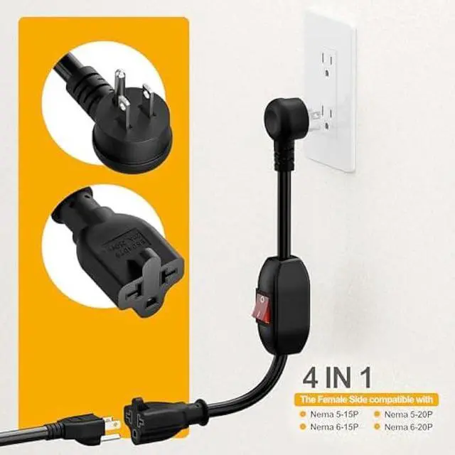 Heavy Duty 12AWG cord with double break 23A 125V/16A 250V on/off switch, Angled Nema 5-15P (3-Prong male) to 4-in-1 T-blade receptacle for your ev car charging. The On/Off [Double Break] switch rated @ [23Amp 125Volt and 16Amp 250V], 3 Outlet USA Canada extension power cord with 23-Amp/125Volt on off switch for your household 3-Prong power devices.