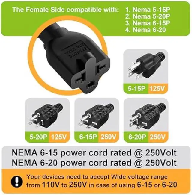 [Compatible 3]: Nema 5-15P 15-AMP Male (125V) to Nema 6-15R 15-AMP Male (250V) Female ac adapter. [Compatible 4]: Nema 5-15P 15-AMP Male (125V) to Nema 6-20R 20-AMP Male (250V) Female ac adapte