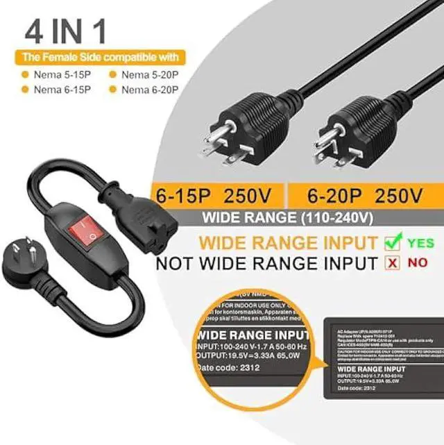 [4-in-1] Nema 5-15P 15-AMP male 125V to Nema 5-15R/5-20R/6-15R/6-20R ac adapter Your devices need to support WIDE RANGE VOLTAGE [range 110V to 220V] in case of connect to Nema 6-15P or Nema 6-20P 15A/20A 250V ac power devices.