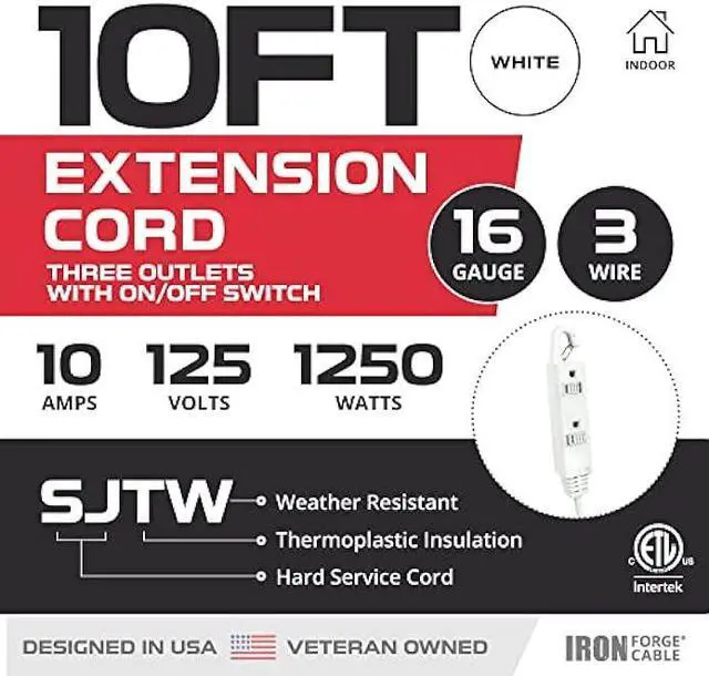 Veteran Owned: This 3 Outlet, 3-wire extension cord is ETL listed, ensuring compliance with stringent safety standards. The 10-foot cord features durable 16 AWG/16 Gauge wire, supporting up to 10 amps at 125V and 1250 watts. While the cord itself is SJTW rated for outdoor conditions (-40°F to +140°F), the switch is not water-resistant.