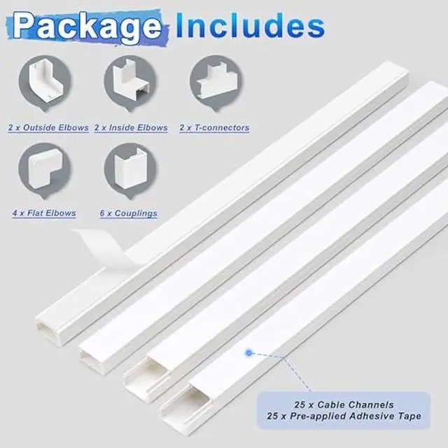 Simple to install: Peel off the self-adhesive backing and conceal cords in the wall 25 individual wire channels, enough length to meet your needs. It has a smooth cutting surface, and can be easily installed without accessories for a seamless connection. You can also use the accessories as connections and extend your installation range to hide corners or cable nooks.