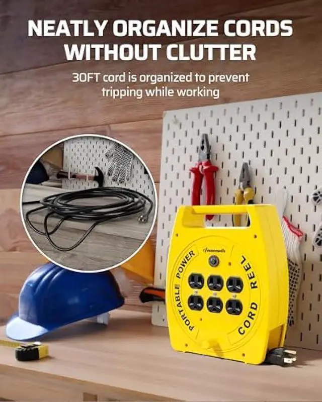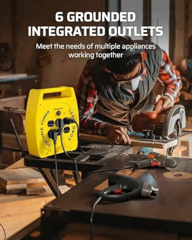 [6-Outlet Power Hub] Equipped with six outlets, this retractable power cord reel enables multiple devices at the same time, from powering drills, saws, and work lights in the garage to lighting, speakers, and projectors at outdoor party; 13A, 125V, 1625W