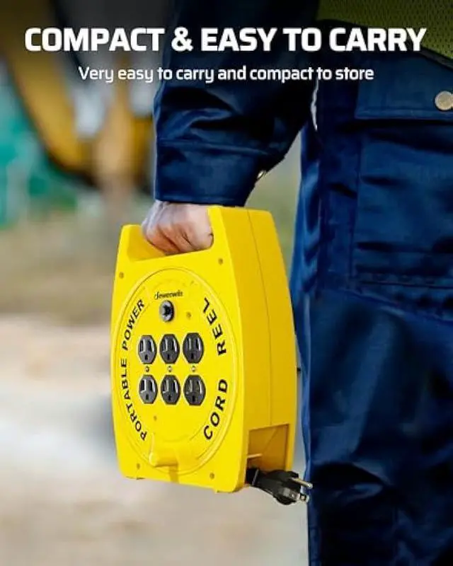 [No-Tangle & Compact] Featuring a retractable winding system, this electrical cord reel allows for easy organization, preventing tangles and cable clutter; a compact structure with a top handle ensures effortless portability and space-saving storage, keeping the cords neat and tidy for next use