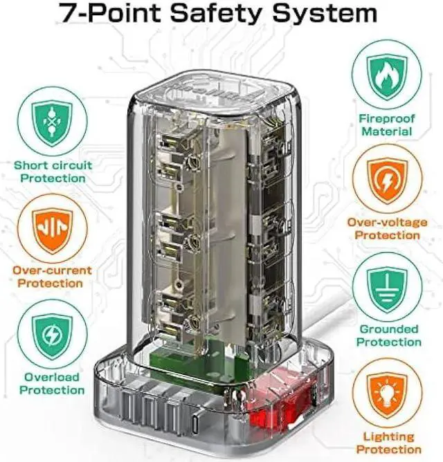 Safe and Ease of use The 6.5FT upgraded extension cord with multiple outlets is made of pure copper. Reinforced design at the junction of the stand of power strip tower and the wire head. To protect the terminal from wear and tear. Environmental protection and fire-resistance PC shell with flame retardant at 1382 makes it more safe and longer lifetime.