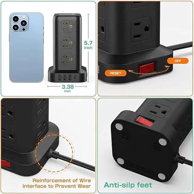 16 IN 1 Tower Power Strip with USB- This power strip tower surge protector with 12 AC outlets and 4 smart USB (1 USB C) charging ports(5V/ 3.4A ) can power up to 16 electronic devices simultaneously. Integrated circuit breaker and 1200 Joules protection rating ensure the safety of your electronics.