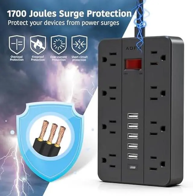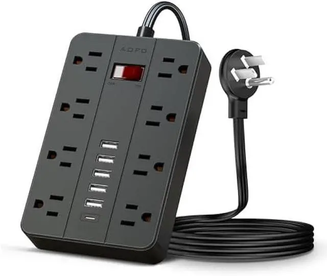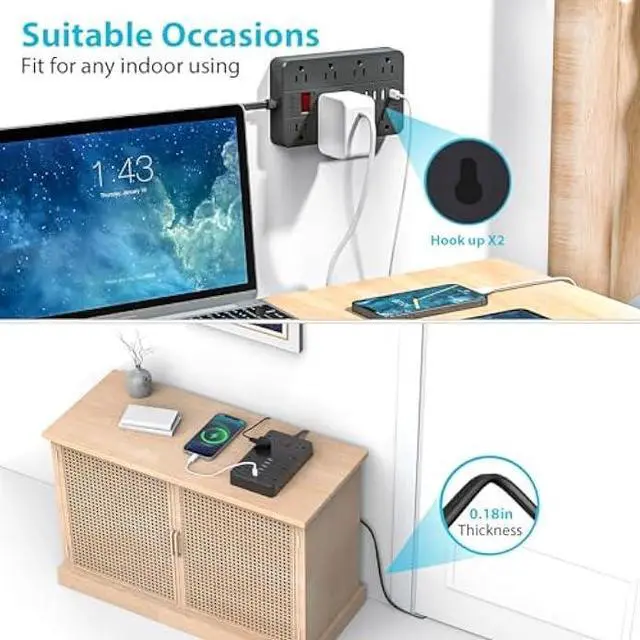 14 IN 1 Power Strip with USBThis flat extension cord surge protector with 8AC widely outlets and 6 USB charging ports (1 USB C Port) can charge 14 devices simultaneously without blocking, keep your desktop organized; You can use it in any indoor place such as home, office and dorm room