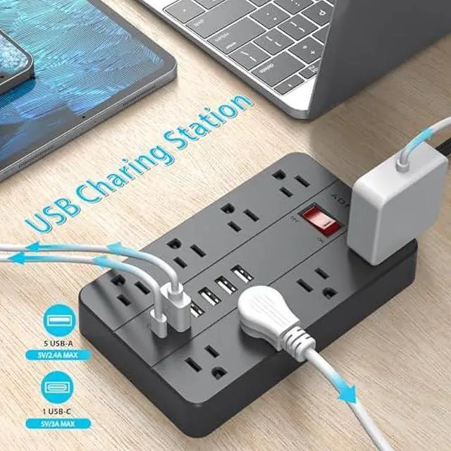 6USB Charging StationThe power strip with USB C port can charge up to 5V/3A. USB-A ports can charge up to 5V/ 2.4A Max. 2 types of USB ports can detect charged devices and deliver optimal charging speed, giving you more charging options; fit for your iphone, ipad, teblet, earphone etc