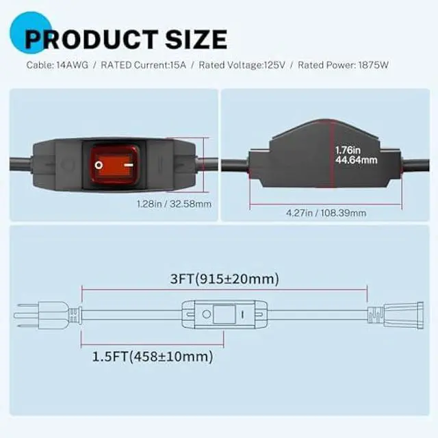 Waterproof Inline Switch: This 3-prong extension cord features a convenient waterproof LED inline switch, allowing you to easily control power both indoors and outdoors. Rated for 15A and 125V, the switch ensures safe and reliable operation in any environment