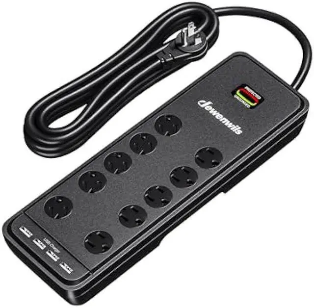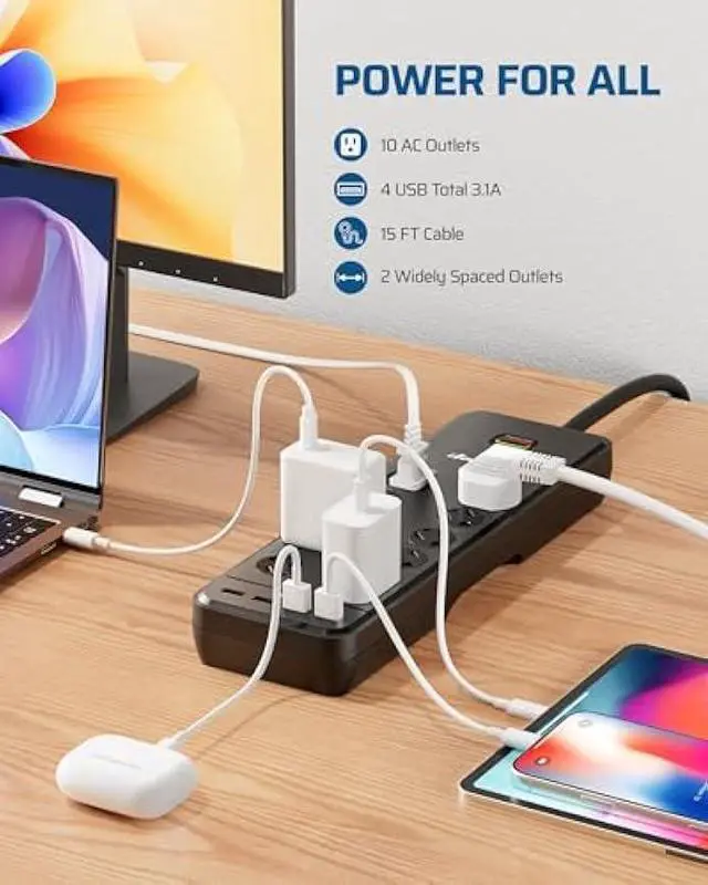 10-Outlet Power Strip with 4USB Ports10 grounded AC outlets (15A/1800W, 3 prong) with 2 widely spaced outlets for bulkier plugs, ideal for home or office use; 4